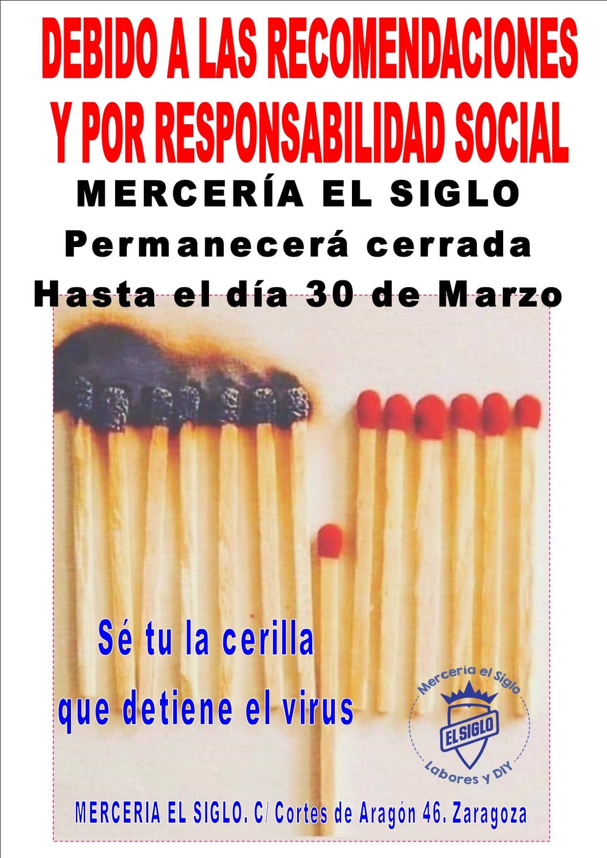 Así que Mercería El Siglo permanecerá cerrada hasta el próximo día 30 de Marzo y puede ser más si las autoridades así lo consideran.